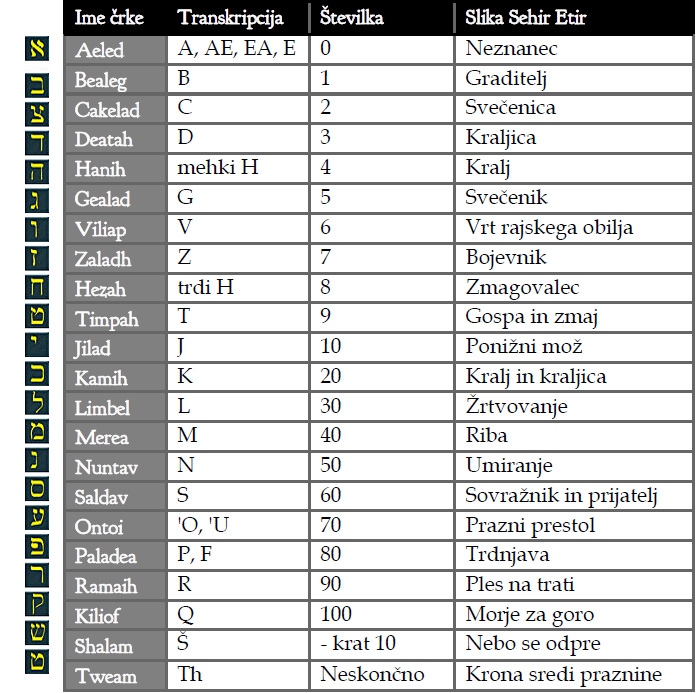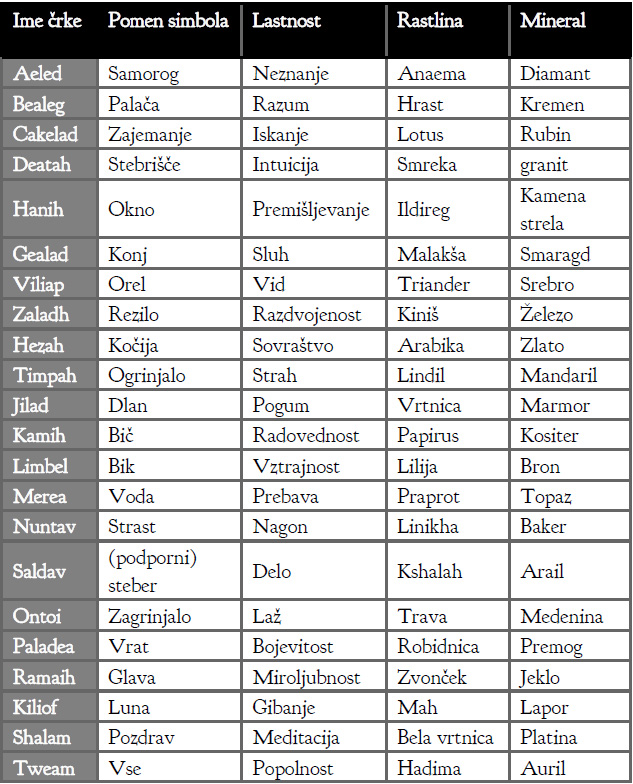 - črke obsegajo bogate korespondenčne tabele, tesno povezane s teologijo, mitologijo in okultizmom